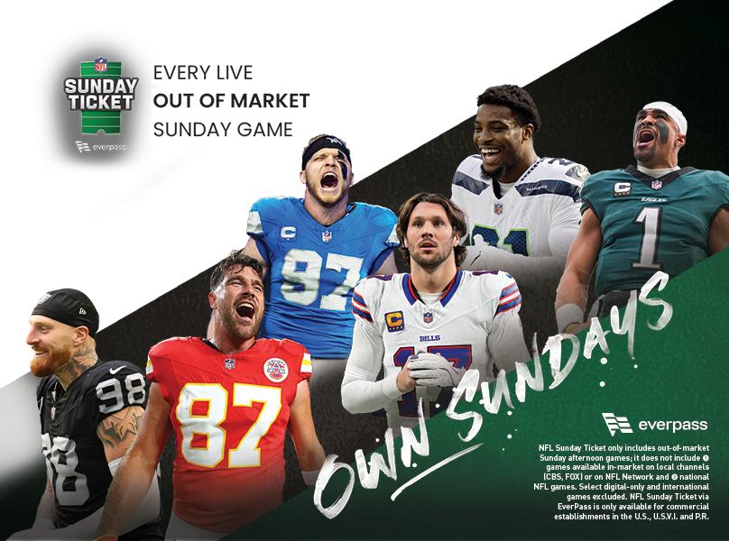 **NFL Sunday Ticket only includes out-of-market Sunday afternoon games; it does not include (1) games available in-market on local channels (CBS, FOX) or on NFL Network and (2) national NFL games. Select digital-only and international games excluded.
